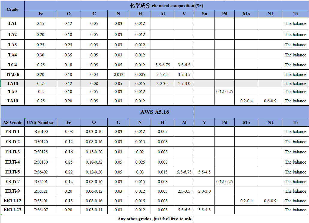 Manufacturing Methods: Forging, drawing Applications: Industrial, medical, aerospace,marine Executive Standards: GB/T3623-2007/NBT47018/ ASTMB 863/AWS A5.16/ ASTM F67/ ASTMF136 etc. For more specifications and grades, please contact our company directly.